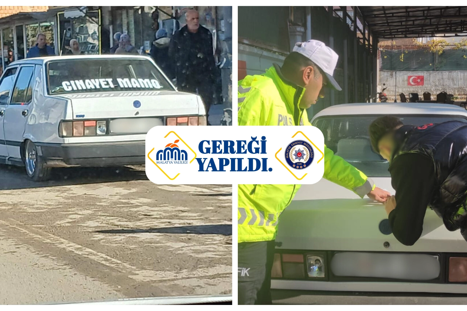 Malatya Emniyet Müdürlüğünden yapılan açıklamada "03 Aralık 2025 günü bir haber sitesinde yer alan haber içeriğindeki bir aracın üzerinde ‘CİNAYET MAMO’ ibaresinin görülmesi üzerine; Haber içeriğinde yer alan araç ve sürücüsü Asayiş ve Trafik Denetleme Şube Müdürlükleri görevlilerimizin yapmış oldukları çalışmalar neticesinde tespit edilmiştir. Tespiti yapılan araç ve M.A. isimli sürücüsü temin edilerek yapmış olduğu ihlalin karşılığı olan idari para cezası uygulanmıştır." denildi.