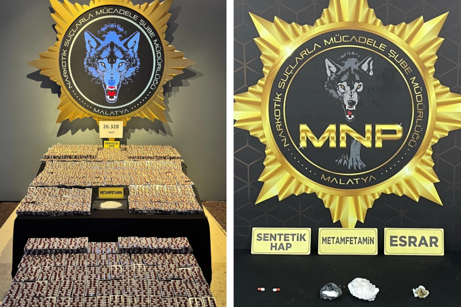 Malatya Valiliğinden yapılan açıklamada "Narkotik Suçlarla Mücadele Şube Müdürlüğü Ekiplerimizce 'Torbacı' olarak tabir edilen sokak satıcısı şahıslara yönelik fiziki takiple yapılan 2 farklı operasyonda; 7 şahsa ait 2 araç ve 5 ikamet üzerinde yapılan aramalarda: 26.330 adet Sentetik Ecza Hap, 81 gram Metamfetamin maddesi, 1.7 gram Esrar Maddesi ele geçirilmiş ve 7 şüpheli şahıs çıkartıldıkları adli makamlarca tutuklandımıştır" denildi.