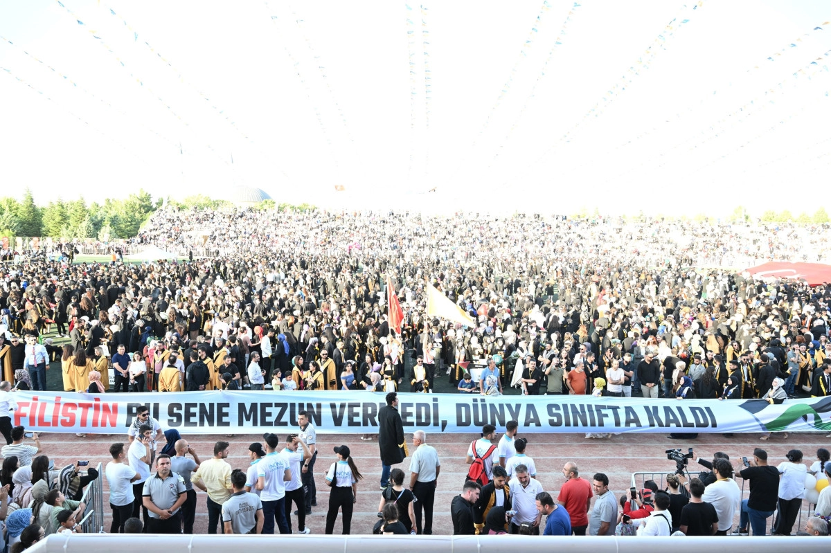 İnönü Üniversitesi Statyumunda yapılan 2023-2024 akademik yılı mezuniyet töreninde akademisyen ve öğrenciler tarafından kortej yürüyüşü yapıldı. Törende dev Türk ve Filistin bayrakları yer aldı, bazı öğrenci ve protokol üyeleri de Filistin atkısı taktı.