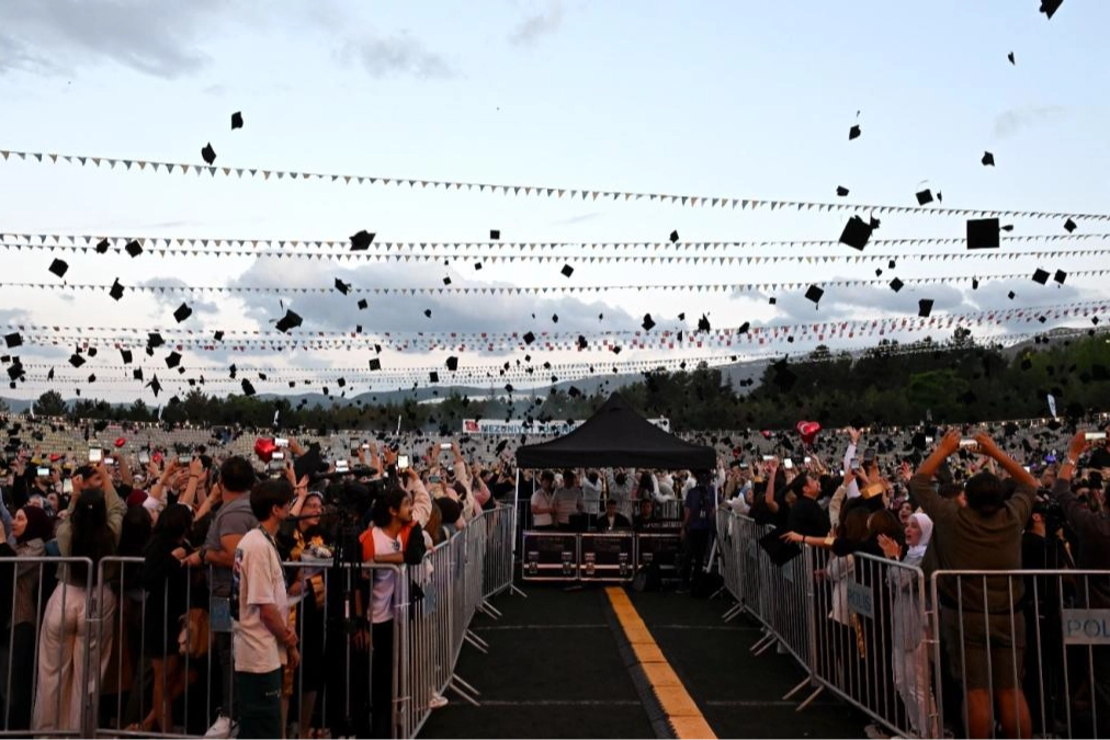 Tören, saygı duruşu ve İstiklal Marşı’nın okunmasının ardından mezun olan öğrencilerin kortej yürüyüşüyle devam etti. Renkli görüntülere sahne olan kortej yürüyüşünde Filistin bayrakları da dalgalandırıldı. Öğrencilerin taşıdığı “Filistin bu sene mezun vermedi. Dünya, sınıfta kaldı.” pankartı ise yürek burktu.
