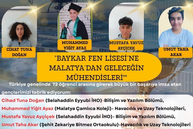 Malatya Milli Eğitim Müdürü Behçet Bakır "Güzel haberlerimiz devam ediyor" diyerek "Malatya' mızdan Toplam 72 Öğrencimiz @BaykarTech Fen Lisesine yerleşmeyi başardı. 72 öğrenci arasına girerek önemli bir başarı elde eden öğrencilerimizi tebrik ediyorum" dedi.