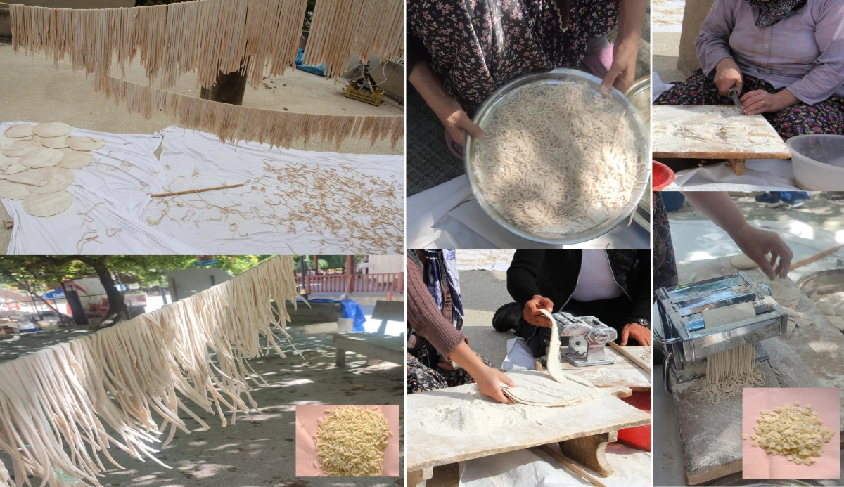 UN, SU VE TUZ KARIŞIMIMakine ile kesim yapan Remziye Yalım, “İmece usulü komşu dayanışması ile erişte bazı yörelerde hala kesiliyor. Biz de 3 komşu birleşerek eriştemizi kestik. Erişte hamuruna biz sadece un, su ve tuz katıyoruz, ayrıca mayalanmıyor. Başka yörelerde hamuruna yağ ve yumurta katanlar da var ama biz asla katmıyoruz. Çünkü sade şekli ile kilerde uzun süre muhafaza edilebiliyoruz. Hamurumuzu iyice yoğuruyoruz biraz sert olması gerek. Yumaklarımızı alıyoruz. Üstlerine bir naylon örtüyoruz.
