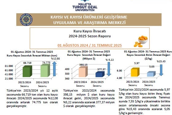 Malatya Turgut Özal Üniversitesi Kayısı ve Kayısı Ürünleri Geliştirme Uygulama ve Araştırma Merkezi tarafından hazırlanan 2024-2025 sezonu (1 Ağustos 2024 – 31 Temmuz 2025) ile Temmuz 2025 dönemine ait Kuru Kayısı Dış Ticaret Raporu, sektöre ilişkin güncel ihracat verilerini ve gelişmeleri kapsamlı biçimde ortaya koydu. Rapordan Öne Çıkan Bulgular: 1. 2024–2025 Sezonu Genel Değerlendirmesi Toplam ihracat miktarı, önceki sezona göre 8 bin ton artarak yaklaşık 75 bin ton olarak gerçekleşmiştir. Ancak, birim ihracat fiyatında 0,90 ABD doları civarında bir düşüş yaşanması sonucu, toplam ihracat geliri %15 azalarak 377 milyon dolara gerilemiştir. (Bir önceki sezon ihracat geliri: 398 milyon dolardı) 2. 2025 Yılı Ocak–Temmuz Dönemi Bu dönemde gerçekleştirilen kuru kayısı ihracatı, geçen yılın aynı dönemine göre %5 azalarak 33 bin ton seviyesinde kalmıştır. Aynı dönemde birim fiyatların 0,70 dolar azalarak 5,28 dolara düşmesi, toplam ihracat gelirini 175 milyon dolar seviyesine çekmiştir. 3. 2025 Temmuz Ayı Verileri İhracat miktarı, geçen yılın aynı ayına göre %18 oranında azalarak 2858 ton olmuştur. Ancak, birim ihracat fiyatı yaklaşık 2 dolar artarak 7,55 ABD doları seviyesine yükselmiş, bu sayede toplam ihracat geliri 21,5 milyon dolara ulaşmıştır. (Geçen yıl Temmuz ayı geliri: 19,5 milyon dolar) 4. Zirai Don Etkisi 11–12 Nisan 2025 tarihlerinde yaşanan zirai don olayı, ihracat miktarında düşüş eğilimini pekiştirmiştir. Buna karşın, sınırlı arz nedeniyle birim ihracat fiyatı artış eğilimi göstererek 8 ABD dolarına yaklaşmıştır.