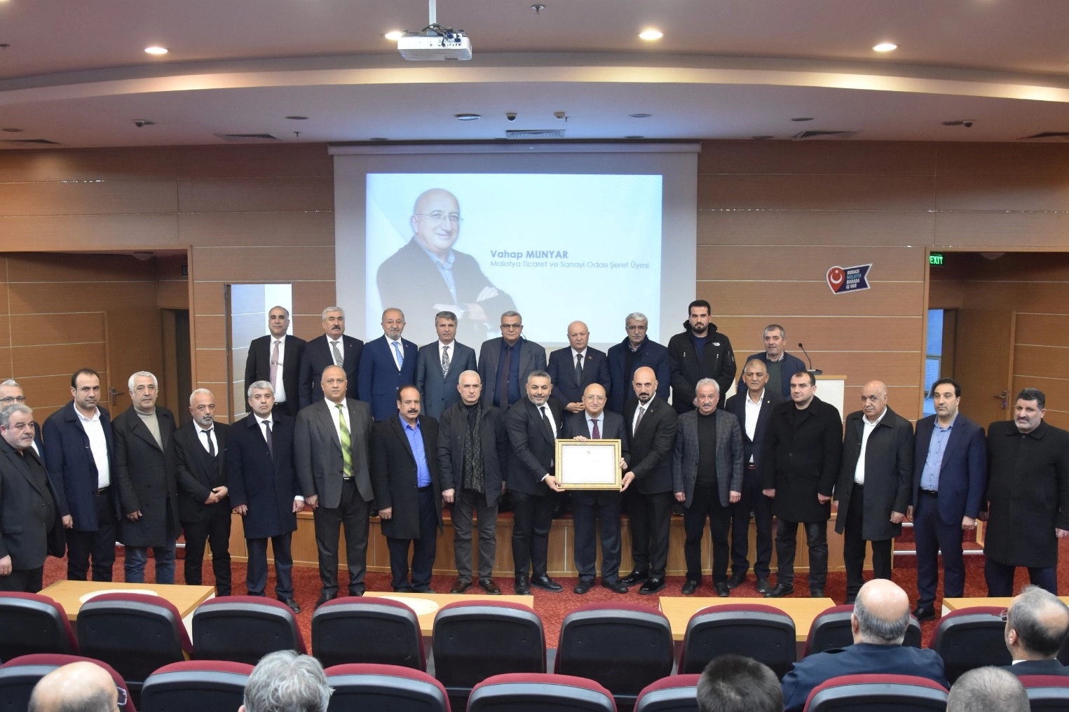 Yapılan konuşmaların ardından Başkan Sadıkoğlu tarafından Vahap Munyar’a “Malatya Ticaret ve Sanayi Odası Şeref Üyesi Beratı” takdim edildi.