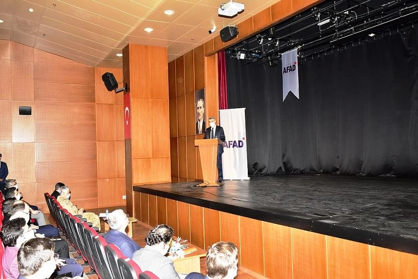 İl Afet ve Acil Durum Müdürlü Mustafa Türker yaptığı konuşmada, “Toplumda afet farkındalığının gelişmesi ve afet kültürünün yerleşmesi, yaşadığımız afet deneyimlerinden ders çıkararak bilgilerin kalıcılığının sağlanması, toplumda risk azaltma ve önlem alma konusunda davranış değişikliğinin oluşturulması ve bu şekilde afete hazır bir toplum oluşturulması hedefini gerçekleştirmek üzere İçişleri Bakanlığımızca Bakanımız Süleyman Soylu'nun talimatları ve öncülüğünde 2001 yılı “Afet Farkındalığı Eğitim Yılı” olarak ilan edilmiştir” dedi ve farkındalığın oluşmasına yönelik İçişleri Bakanlığı tarafından hazırlanan sunumu yaptı.