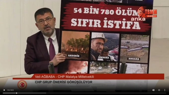 CHP Malatya Milletvekili Veli Ağbaba, TBMM Genel kurulunda kürsüye üzerinde '54 Bin 780 Ölüm Sıfır İstifa' yazan görselle çıktı. Ağbaba, yaptığı konuşmada şu ifadeleri kullandı;