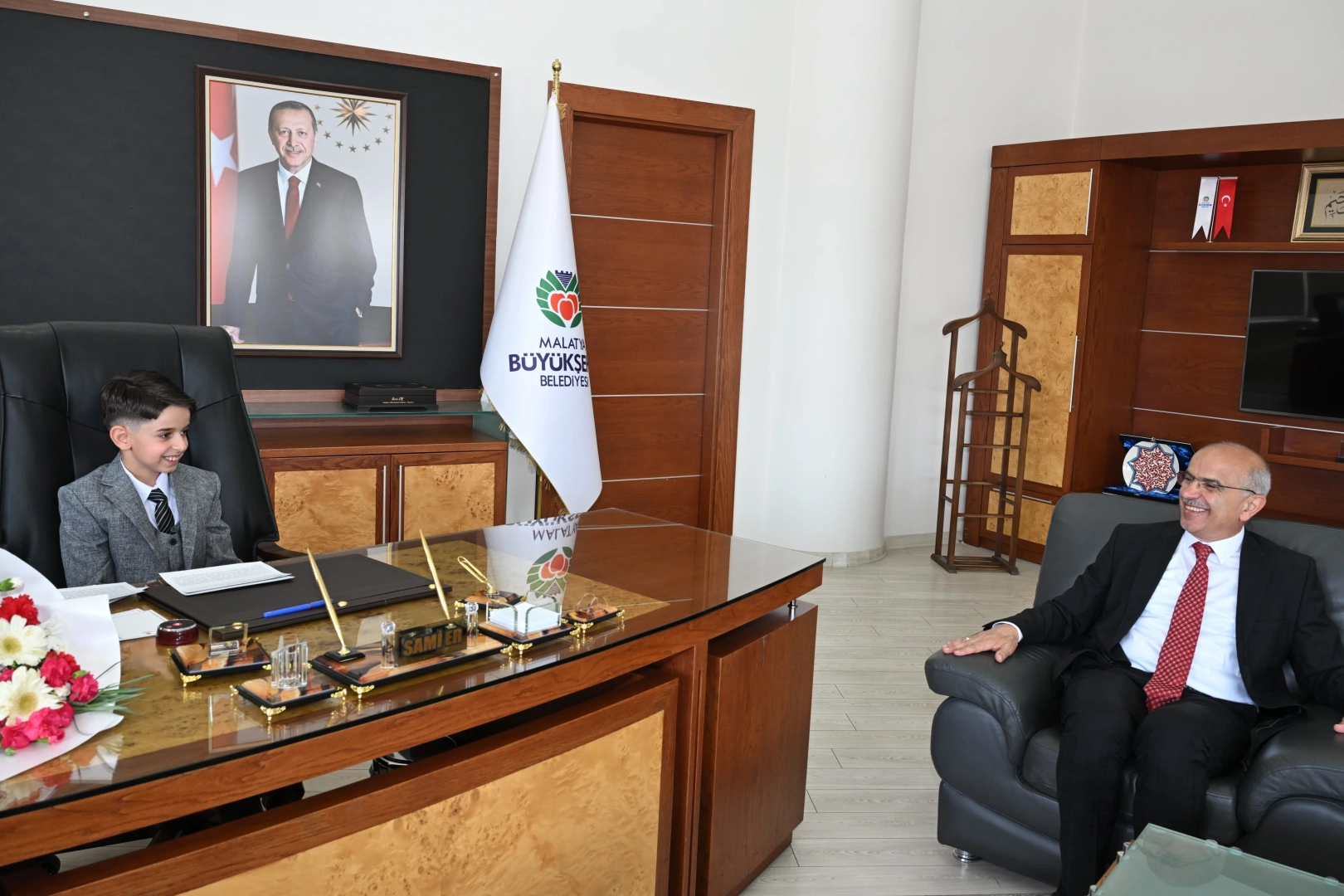 Başkanlık koltuğunu Çoloğlu’na devretmeden kısa bir konuşma gerçekleştiren Büyükşehir Belediye Başkanı Sami Er ise ziyaretten duyduğu memnuniyeti ifade ederek, “Özel bir günde özel bir anı yaşıyoruz. Bugün 23 Nisan Ulusal Egemenlik ve Çocuk Bayramı birazdan görevimizi TOBB Malatya Hafız İmam Hatip Ortaokulu 6. Sınıf öğrencimiz Hafız Muhammed Çoloğlu’na devredeceğiz.