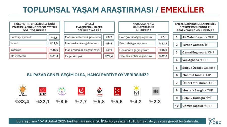 ORC Araştırma, 15-19 Şubat tarihleri arasında 26 ilde 45 yaş üzeri 1610 emekli ile yaptığı yüz yüze anket çalışmalarında, emeklilere, ‘’Hükümetin emeklilerle ilgili politikaları ne derece yeterli görüyorsunuz? Emekli maaşınızdan başka ek geliriniz varmı? Geçiminizi sağlayabiliyor musunuz? Sorunlarınızı dile getirme konusunda,en beğendiginiz vekil kimdir?’’ sorularını yöneltti.
