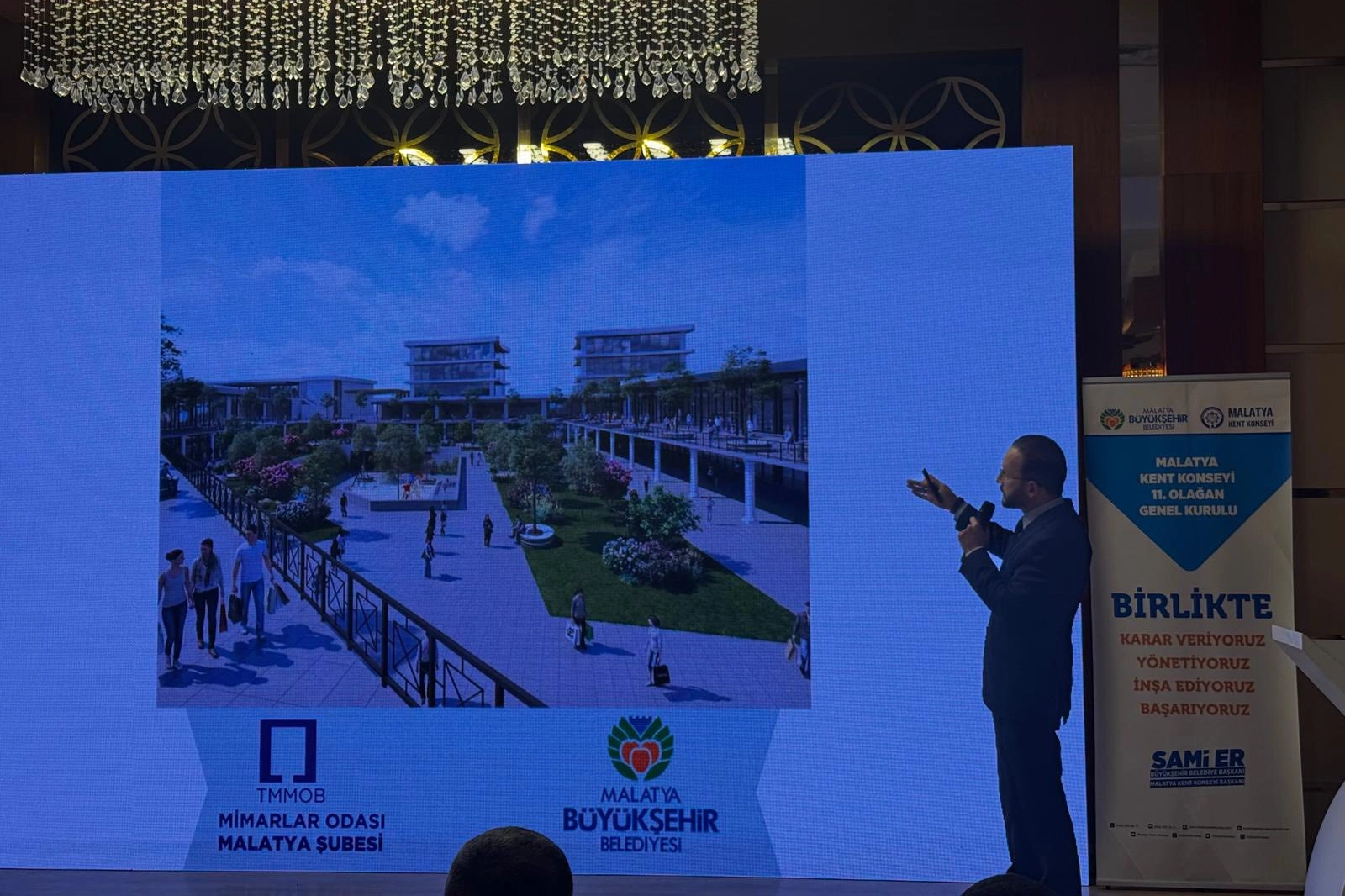 " 'Toplum için Mimarlık' misyonumuz doğrultusunda gönüllü mimar meslektaşlarımızın 3 ay süren özverili çalışmaları sonucunda Malatya'mız için yeni bir proje hazırladık. Hak sahipleri mağdur edilmeden yeni yapılacak projede maddi değeri çok daha yüksek olan dükkanları tekrardan verilerek, bütün kente hizmet edecek olan konsept ticari merkez projemizin sunumunu Malatya Kent Konseyi Olağan Genel Kurulu'nda gerçekleştirdik.