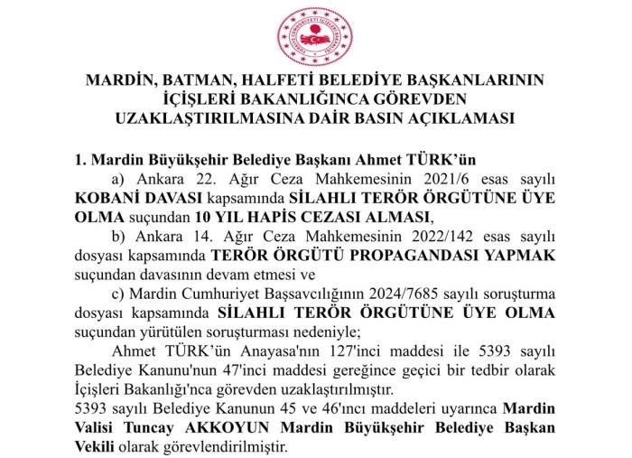İçişlerin Bakanlığı'ndan yapılan açıklamayada, Mardin Büyükşehir Belediye Başkanı Ahmet Türk'ün; Silahlı Terör Örgütüne Üye Olma suçundan 10 yıl hapis cezası alması ve Terör Örgütü Propagandası Yapmak suçlarından devam eden soruşturmaları dolayısıyla görevinden uzaklaştırıldığı yerine ise Mardin Valisi Tuncay Akkoyun Mardin Büyükşehir Belediye Başkan Vekili olarak görevlendirildiği belirtildi.