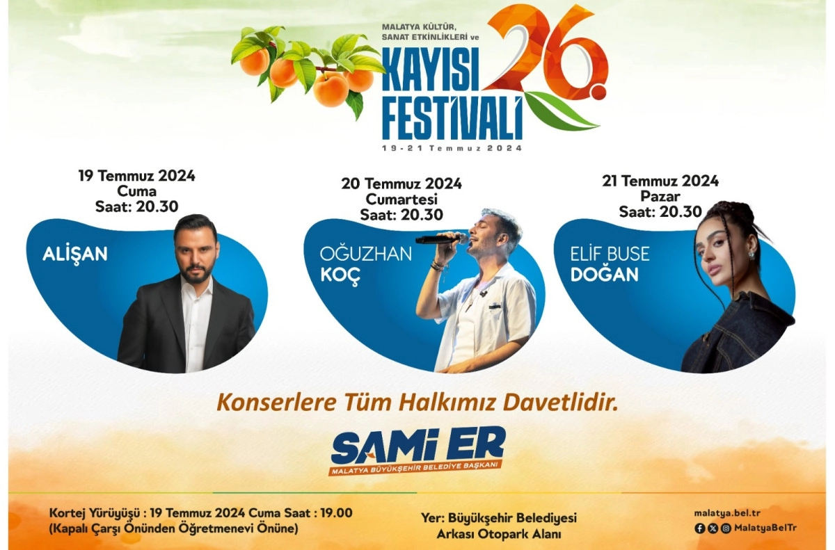 20 Temmuz Cumartesi Günü: KAYISILI PASTA VE TATLILARI YARIŞMASI Yer: Kernek Külliyesi / Saat: 13.00 KONSER: OĞUZHAN KOÇ Yer: Büyükşehir Belediyesi Arkası / Saat: 21.00 21 Temmuz Pazar Günü: KONSER: ELİF BUSE DOĞAN Yer: Büyükşehir Belediyesi Arkası / Saat: 21.00