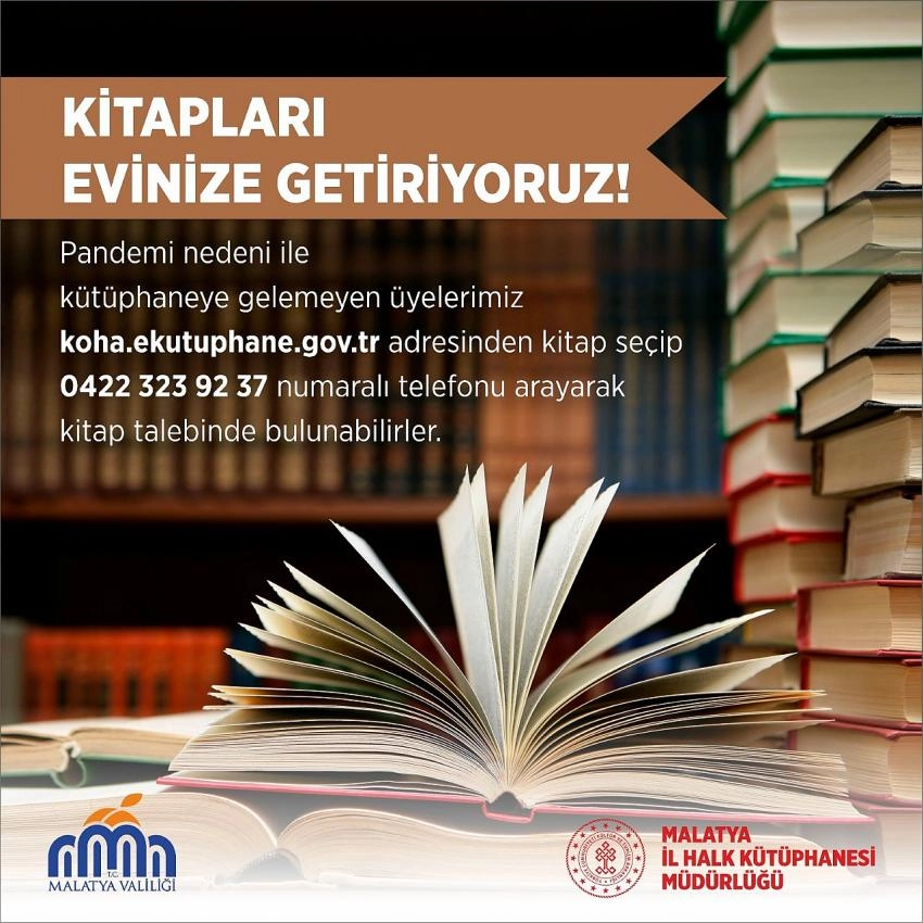 Düşüş rakamlarının iletildiği Malatya Valisi Aydın Barış’ın öneri ve talimatıyla İl Kültür ve Turizm Müdürlüğü tarafından “Kitapları Evinize Getiriyoruz” kampanyası başlatıldı. Üyeler, Kültür ve Turizm Bakanlığı Kütüphaneler ve Yayımlar Genel Müdürlüğünden web sitesi adresine giriş yapıp (koha.ekutuphane.gov.tr) istediği kitabı seçtikten sonra 0422 323 92 37 numaralı telefonu arayarak kitap talebinde bulunabilecek.