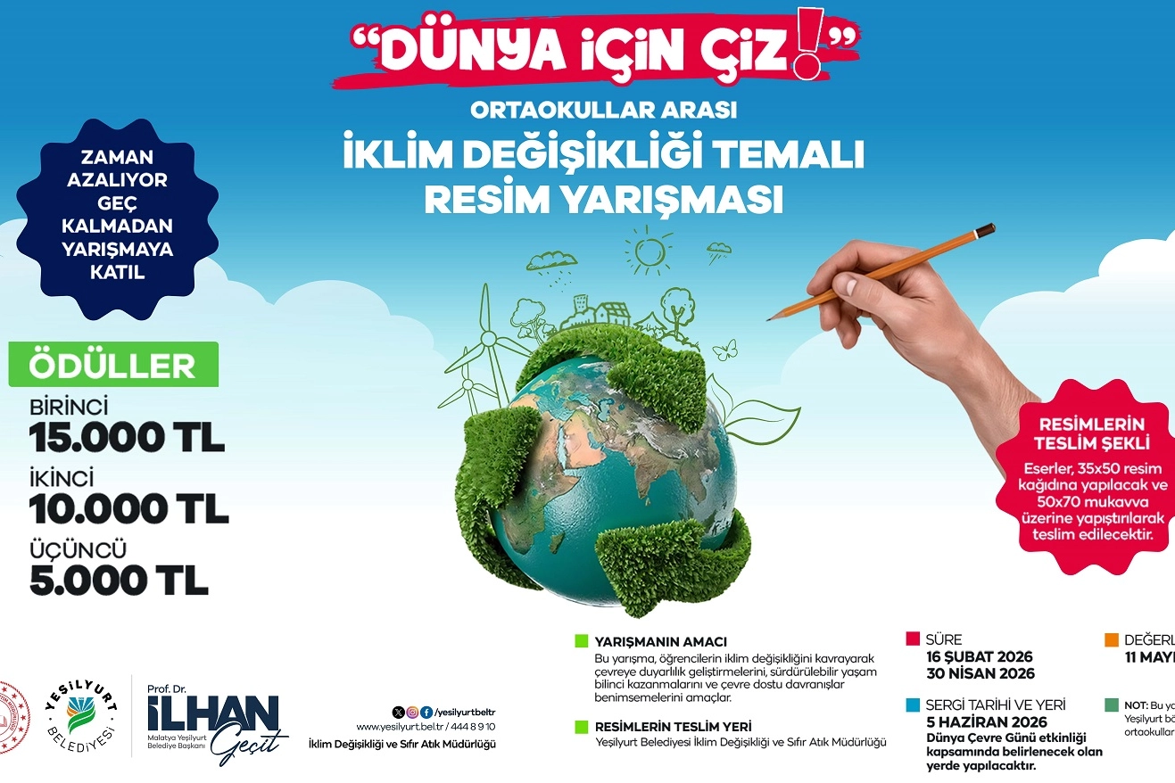 İklim değişikliği, çevre kirliliği ve sürdürülebilir yaşam konularında farkındalık oluşturmayı hedefleyen yarışma, gençlerin hayal gücünü sanatla buluştururken aynı zamanda doğaya karşı sorumluluk bilincini de artırmayı amaçlıyor. Yarışmaya katılan öğrenciler, dünyayı koruma mesajlarını resimleriyle anlatacak. BAŞVURULAR 30 NİSAN’DA SONA ERECEK 16 Şubat 2026 tarihinde başlayan başvurular, 30 Nisan 2026 tarihine kadar devam edecek. Yarışmaya katılmak isteyen öğrenciler, hazırladıkları eserleri Yeşilyurt Belediyesi İklim Değişikliği ve Sıfır Atık Müdürlüğü’ne teslim edebilecek. Yarışmada dereceye giren öğrenciler için cazip ödüller de belirlendi. Buna göre; birinciye 15 bin TL, ikinciye 10 bin TL ve üçüncüye ise 5 bin TL ödül verilecek. ESERLER DÜNYA ÇEVRE GÜNÜ’NDE SERGİLENECEK Yarışmada dereceye giren ve sergilenmeye değer bulunan eserler, 5 Haziran Dünya Çevre Günü kapsamında düzenlenecek programda sanatseverlerle buluşturulacak. Aynı gün gerçekleştirilecek ödül töreniyle başarılı öğrenciler ödüllerine kavuşacak. Yeşilyurt Belediye Başkanı Prof. Dr. İlhan Geçit, yarışmaya ilişkin yaptığı açıklamada gençleri doğaya sahip çıkmaya davet ederek, “Geleceğimizin teminatı olan gençlerimizin çevreye duyarlı bireyler olarak yetişmesi en büyük arzumuzdur. ‘Dünya İçin Çiz’ yarışmamızla çocuklarımızın hem sanatsal yeteneklerini geliştirmelerini hem de iklim değişikliği konusunda bilinç kazanmalarını hedefliyoruz. Tüm öğrencilerimizi bu anlamlı yarışmaya katılmaya davet ediyoruz.” ifadelerini kullandı.