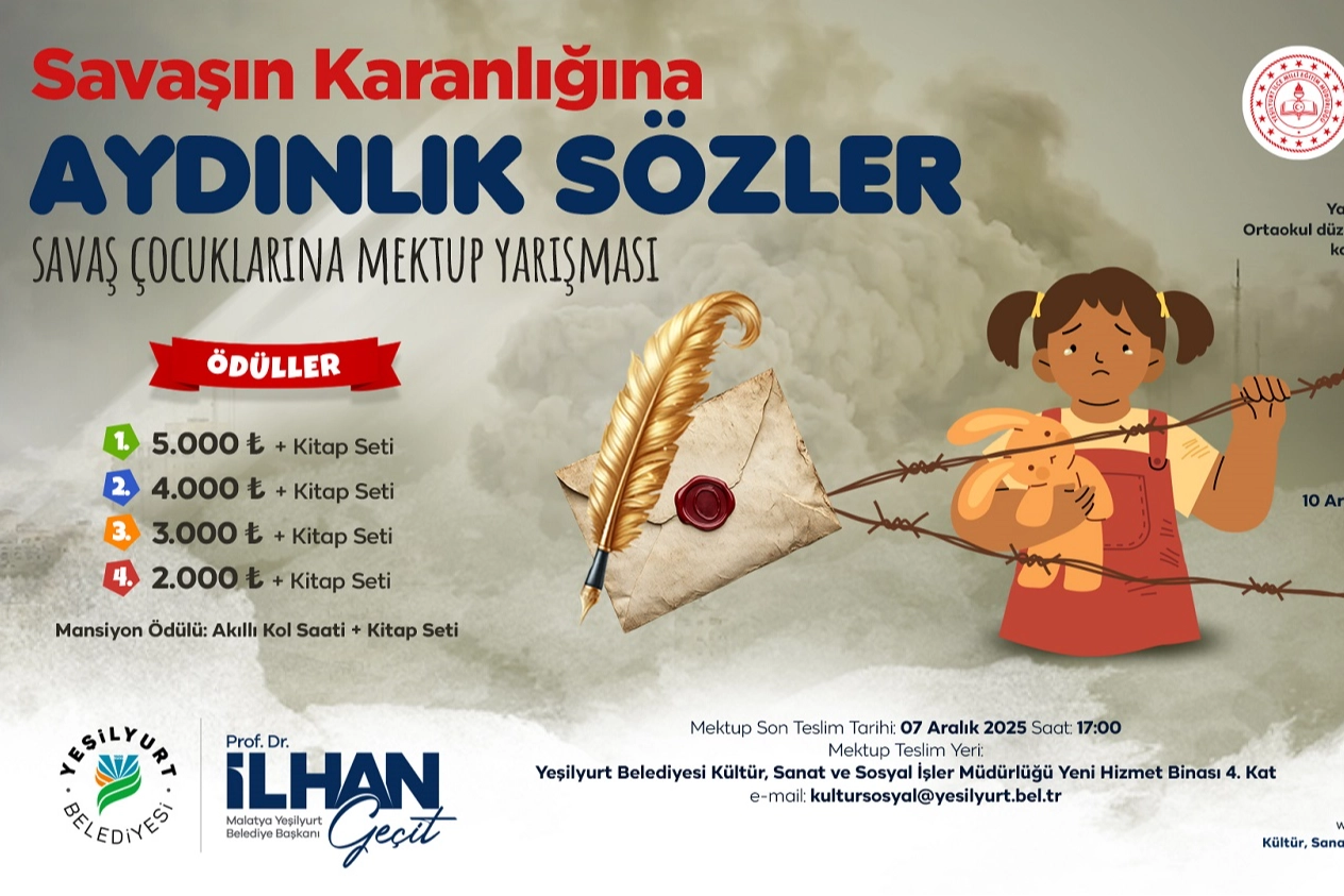 Yeşilyurt Belediyesi ile Yeşilyurt İlçe Milli Eğitim Müdürlüğü, ‘20 Kasım Dünya Çocuk Hakları Günü’ ve ‘10 Aralık Dünya İnsan Hakları Günü’ etkinlikleri kapsamında; “Savaşın Karanlığına Aydınlık Sözler” temalı Savaş Çocuklarına Mektup Yarışması düzenliyor.