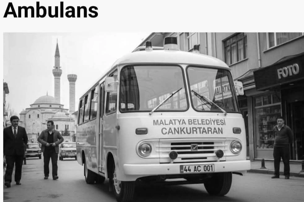 Tarih 1960'lı Yılları gösteriyor. Malatya Belediyesi CANKURTARAN yazıyor. Malatya'da İlj Sıhhi İmdat- Ambulans.Plakası da 44 AC 001. Yani günümüzün Ambulansı. Hasta taşımak için hizmet veriyor.
