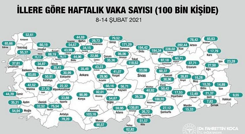 Korona virüs testlerinde açıklanan rakamlar hala korkutucu. Malatya’dan 20 kat fazla nüfusu barındıran İstanbul’da yapılan 100 bin testten 60’ı pozitif çıkarken, Malatya’da yapılan 100 bin testten 41’i pozitif çıktı. 800 yüz bin nüfusta bu oran 320 vaka sayısına tekabül ediyor. Bölge illeri arasında Adıyaman ve Elazığ en fazla vaka görülen iller olurken Malatya 3 sırada yer aldı. Son 1 hafta içinde yapılan testlerde korona testi pozitif çıkan bölge illeri arasında Adıyaman 100 bin kişide 100 kişi, Elazığ 100 bin kişide 50 pozitif vaka sayısı ile ilk 2 sırayı paylaşırken, Malatya, yapılan 100 bin testten 41 kişide pozitif vaka görüldü. Sağlık Bakanlığının, “Yerinde karar dönemi” kapsamında her hafta başında illere göre vaka sayısının paylaşılacağı verilere göre Malatya’da 8-14 Şubat Tarihleri arasında tespit edilen vaka sayısı haritada belirtildi.