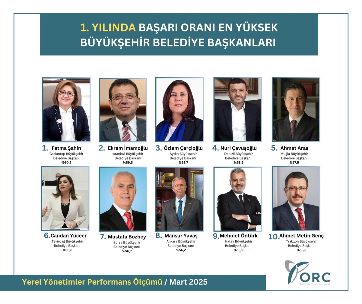 ORC Araştırma Tarafından yapılan ankette 1. Yılında Başarı Oranı En Yüksek Büyükşehir Belediye Başkanları belirlendi. İlk sırada Gaziantep Büyükşehir Belediye Başkanı Fatma Şahin yer alırken, İkinci sıra da ise İstanbul Büyükşehir Belediye Başkanı Ekrem İmamoğlu yer aldı.