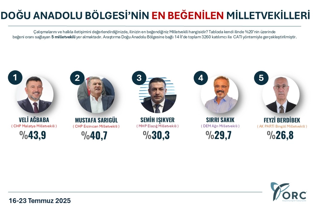 ORC Araştırma Şirketi 16-23 Temmuz tarihleri arasında Doğu Anadolu Bölgesindeki 14 ilde yaşayan 3 bin 260 kişiye "Çalışmalarını ve halkla ilişkilerini değerlendirdiğinizde ilinizin en beğendiğiniz milletvekilleri hangisidir?" diye soruldu.