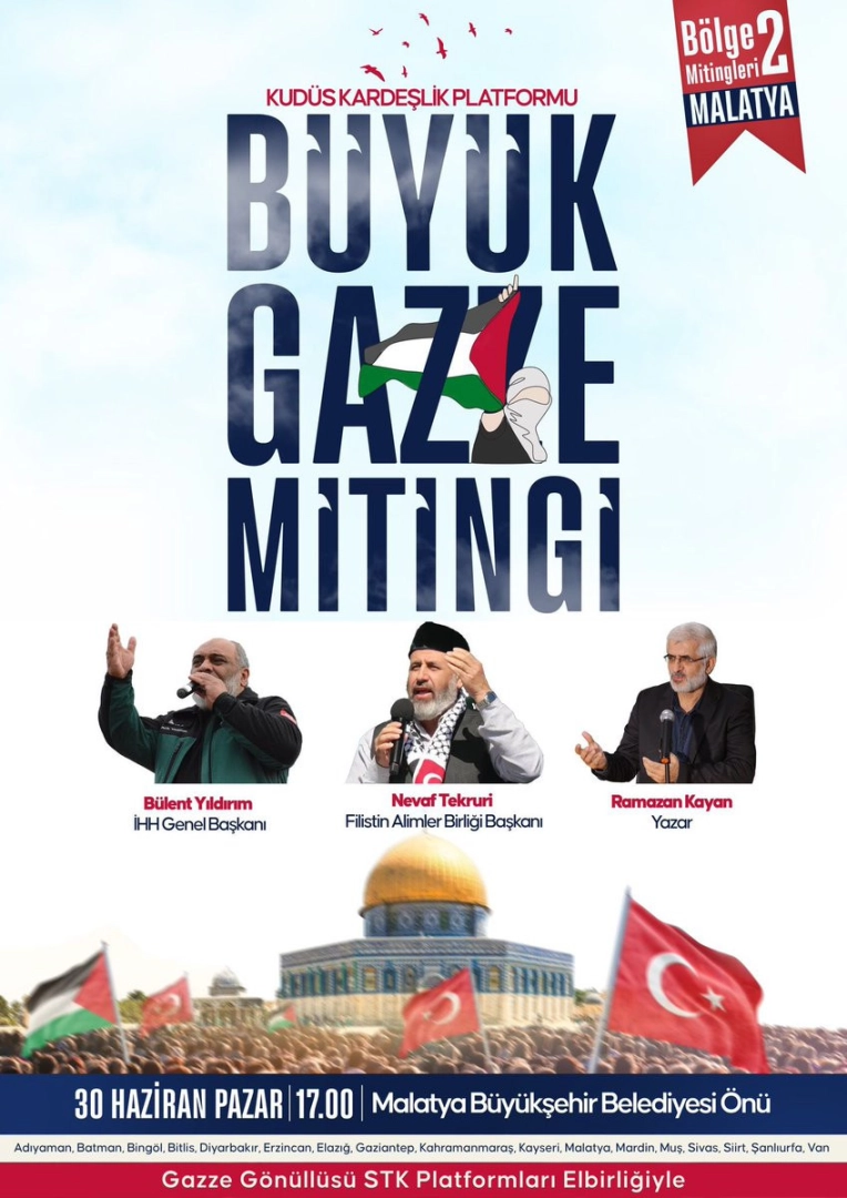 30 Haziran Pazar günü saat 17.00'de Malatya Büyükşehir Belediyesi yanında yapılacak mitingde İHH Genel Başkanı Bülent Yıldırım, Filistin Alimler Birliği Başkanı Nevaf Tekruri ve Yazar Ramazan Kayan birer konuşma yapacak.