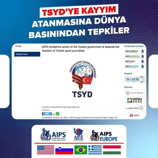 Dünya Spor Yazarları Derneği (AIPS) ve birçok ülkenin meslek kuruluşu, Türkiye Spor Yazarları Derneği (TSYD) Başkanı Oğuz Tongsir ’in görevden alınarak yerine kayyum atanmasına tepki gösterdi.