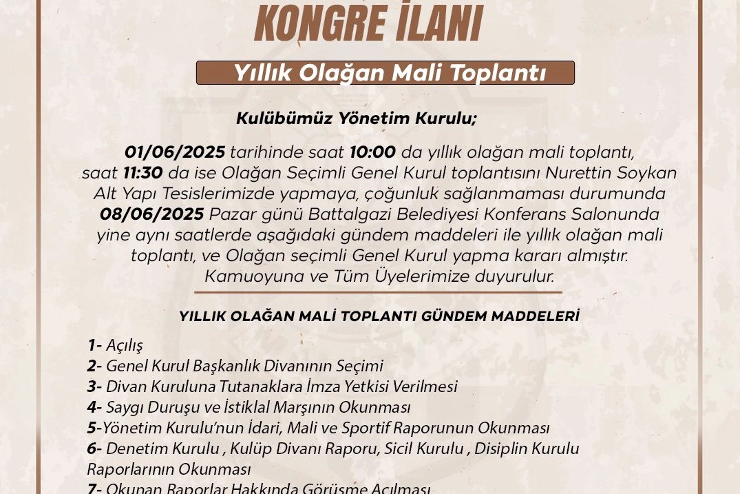Yeni Malatyaspor Kulübünün kongresi 1 Haziran'da yapılacak, çoğunluk sağlanamadığı takdirde kongre 8 Haziran Pazar günü yapılacak.