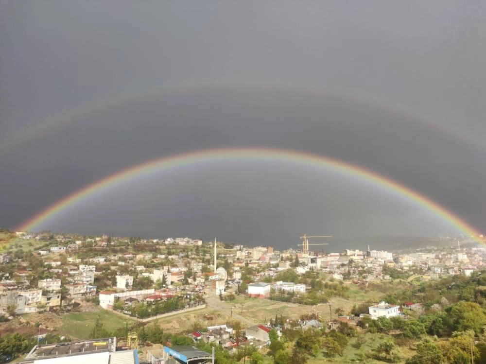 Adıyaman’ın Besni ilçesinde öğle saatlerinde etkili olan yağmurun ardından beliren gökkuşağı, gökyüzünde seyrine doyulmaz bir manzara oluşturdu. Renklerin dansına sahne olan doğa olayı, ilçede yaşayan vatandaşlar tarafından ilgiyle izlendi.