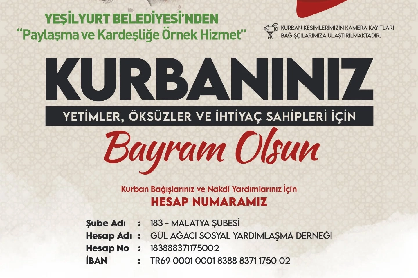 Kurban bağışında bulunmak isteyen hayırsever vatandaşlar, 5 Haziran 2025 Perşembe gününe kadar Ziraat Bankası 183-Malatya Şubesi Gül Ağacı Sosyal Yardımlaşma Derneğinin TR69 0001 0001 8388 8371 1750 02 nolu iban numarasına 22 Bin 700 TL. olan kurban bağış bedelini yatırabilecekler.