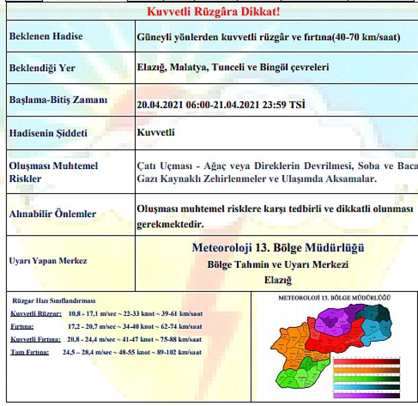 Beklendiği yer; “Elazığ, Malatya, Bingöl ve Tunceli illerinde güney yönlerden kuvvetli rüzgar ve fırtına ( saate 40-70 Km/saat)