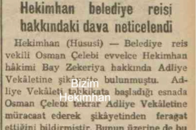 Hekimhan (hususi) Belediye reis vekili Osman Çelebi, evvelce Hekimhan hâkimi Bay Zekeriya hakkında adliye vekaletine şikâyette bulunmuştu. Adliye vekaleti tahkikatında başladığı esnada Osman Çelebi tekrar adliye vekaletine müracaat ederek şikayetinden feragat ettiğini bildirilmiştir. Bunun üzerine de bu hususi kanun hükümlerine uyularak Osman Çelebi hakkında tahkik-haluzum görülmüş ve Osman Çelebi mahkemeye verilmiştir. Malatya'da yapılan duruşması sonunda Osman Çelebi 15 gün müddette hapse konulmasına karar verilmiştir.