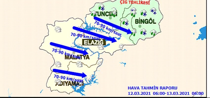 “Malatya, Elâzığ, Tunceli ve Bingöl çevrelerinde gece ve sabah saatlerinde hafif, yer yer orta kuvvette (Malatya’nın kuzey ilçeleri; Darende, Kuluncak, Hekimhan, Arguvan, Arapgir, Yazıhan, Tunceli ve Bingöl il geneli) zirai don riski bulunmaktadır. Özellikle kayısı üreticileri başta olmak üzere yetkililerin ve çiftçilerimizin tedbirli olmaları gerekmektedir. Bingöl ve Tunceli illerimizin yüksek kar örtüsü bulunan dik yamaçlarında çığ oluşma riski bulunduğundan, meydana gelebilecek olumsuzluklara karşı dikkatli ve tedbirli olunması gerekmektedir. Bölgemiz genelinde kuvvetli rüzgâr, fırtına, kuvvetli fırtına ve yer yer tam fırtına