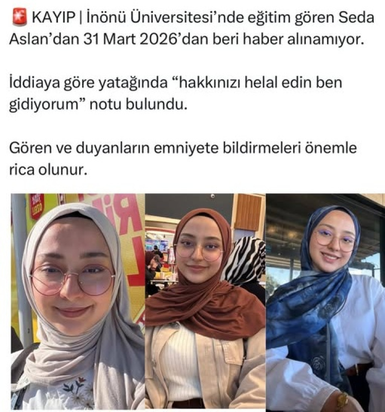 İnönü Güncel'de yer alan habere göre, İnönü Üniversitesi öğrencisi kaldığı yere "Hakkınızı helal edin" diye bir not bırakarak 31 Mart 2026 tarihinden itibaren kayıplara karıştı. Ailesi ve arkadaşlarının haber alamadığı Seda Arslan her yerde aranmaya başladı.