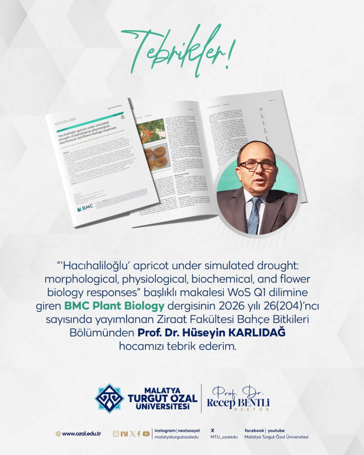 “Üniversitemiz Ziraat Fakültesi Bahçe Bitkileri Bölümü öğretim üyelerinden Prof. Dr. Hüseyin Karlıdağ hocamızın, ‘Hacıhaliloğlu’ apricot under simulated drought: morphological, physiological, biochemical, and flower biology responses’ başlıklı çalışmasının BMC Plant Biology dergisinde (2026, 26. cilt) yayımlanması dolayısıyla hocamızı tebrik ediyor, başarılarının devamını diliyorum.”