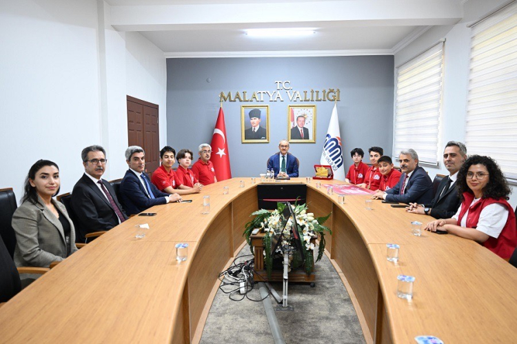 Kuzey Kıbrıs Türk Cumhuriyeti’nde (KKTC) düzenlenen 2025 TEKNOFEST yarışmasında büyük bir başarıya imza atarak birinci olan Malatya Battalgazi Dr. Saadettin Hacıevliyagil İmam Hatip Ortaokulu Fen Bilimleri öğretmeni Hakan Becer danışmanlığında yarışmaya katılan öğrenciler; Malatya Erman Ilıcak Fen Lisesinden Arda Tahsin Ürün ve Egemen Çetmen, Malatya Lisesinden Fatih Polat ve Elanur Özçelik ile Selahattin Eyyubi Anadolu İmam Hatip Lisesinden Halit Karaca'dan oluşan ekip Vali Seddar Yavuz’u makamında ziyaret etti.