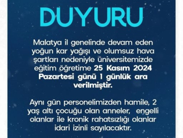 Malatya Turgut Özal Üniversitesi Rektörlüğü,nden yapılan açıklamada "Malatya il genelinde devam eden yoğun kar yağışı ve olumsuz hava şartları nedeniyle üniversitemizde eğitim öğretime 25 Kasım 2024 Pazartesi günü 1 günlük ara verilmiştir. Aynı gün personelimizden hamile, 2 yaş altı çocuğu olan anneler, engelli olanlar ile kronik rahatsızlığı olanlar idari izinli sayılacaktır" denildi.