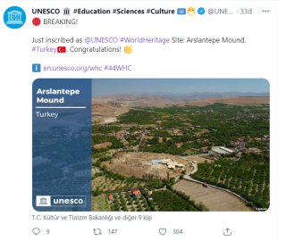 Arslantepe Höyüğü, 44'üncü Dünya Miras Komitesi toplantısında alınan kararla UNESCO dünya mirası listesine dahil edildi. Kültür ve Turizm Bakanlığından yapılan açıklamada, “M.Ö. 4'üncü bin yıl boyunca Doğu Anadolu ve Mezopotamya toplumlarında devletin oluşum sürecindeki esaslı değişiklikleri gösteren Arslantepe Höyüğü, çevrim içi düzenlenen 44'üncü Dünya Miras Komitesi toplantısında alınan kararla dünya mirası oldu.” Duyurusu yapıldı.