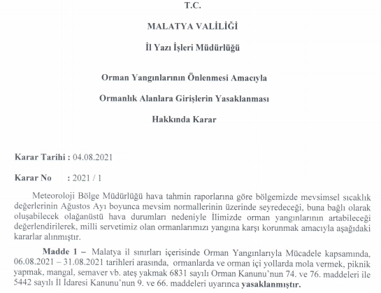 Valilik tarafından yapılan açıklamada; Malatya il sınırları içerisinde orman yangınlarıyla mücadele amacıyla 06-31 Ağustos tarihleri arasında ormanlarda ve orman içi yollarda, ve yetkili idarelerin gözetim ile denetimindeki izinli park, piknik ve mesire alanlarıyla tabiat parklarında mangal ateşi, piknik tüpü ve semaver yakmak yasaklanırken, enerji nakil hatlarının yapım ve bakımıyla ilgili kuruluşların (TEİAŞ, FEDAŞ), hatların özellikle ormanlık alanlardan geçen bölmelerinde gerekli bakımları gerçekleştirmesi, yangın riskine karşı her türlü tedbiri alarak gerektiğinde enerji kesintisi uygulaması ve tüm belediyelerin, orman içi, orman kenarı ve bitişiğinde bulunan çöp toplama alanları çevresinde koruma bandı oluşturması ve yangın riskine karşı gerekli iş makinelerini