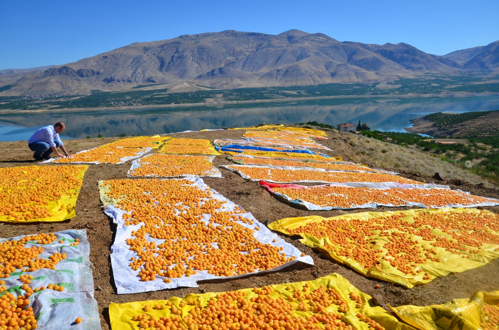 Malatya'da kayısı bahçelerinde görülen sarı renkli kayısılar güneşte kurutulmayı beklerken, Alişan Hayırlı kayısı bahçelerindeki o hummalı çalışmanın eseri olan resimleri sayfalara taşıdı. "Malatya'da gökyüzü mavi yeryüzü sarı..." manşetiyle verilen o muhteşem kayısı resimleri görülüyor.