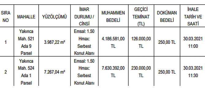 Yakınca semtinde ( Galericiler Sitesi ve Fethi Gemuhluoğlu Anadolu Lisesi) arkası) 521 ada 9 parseldeki 4 bin metrekarelik arsa 4 milyon 186 bin lira muhammen bedelle ve aynı bölgede 524 ada 1 nolu parseldeki 7 bin 600 metrekarelik arsa ise 7 Milyon 600 bin lira muhammen bedelle satışa çıkarıldı. Satışlar 30 Mart’ta kapalı teklif usulü ile Encümen tarafından yapılacak.
