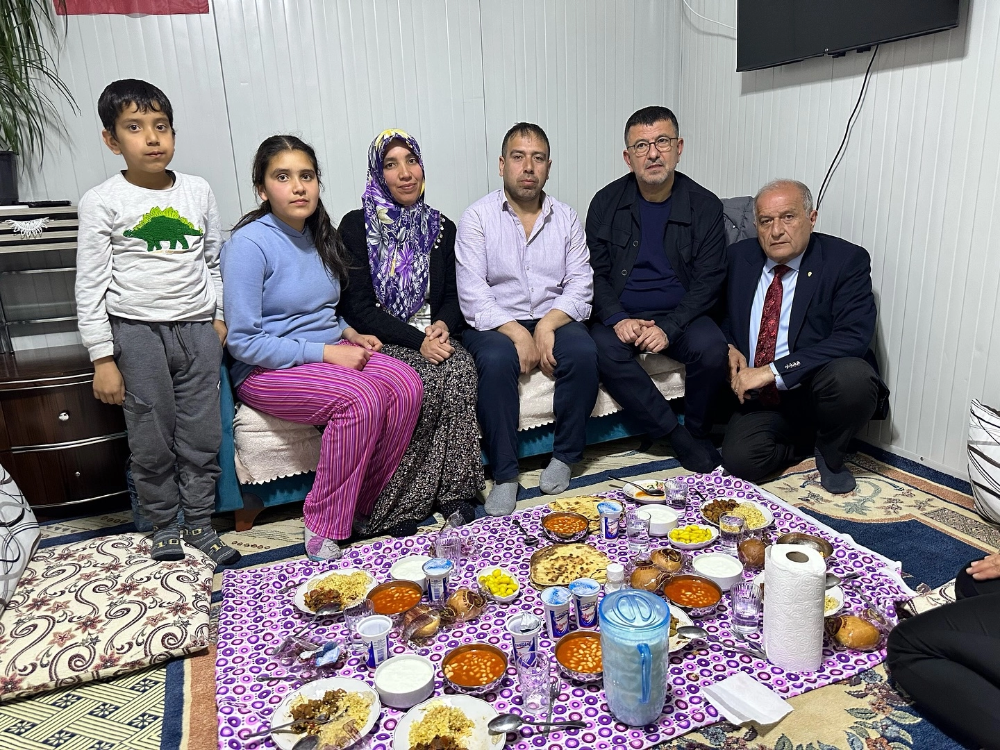 Veli Ağbaba, Hekimhan Belediye Başkanı Mehmet Şerif Yıldırım ve CHP Malatya Kadın Kolları Başkanı Nezahat Aydın, yemek dağıtımı sonrası konteyner kentte yaşayan Bayram ve Rahime Onay ailesinin iftar sofrasına konuk oldu.