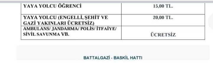 Aydın Derin tarafından gönderilen tarifeye göre, Baskil feribotuna binen her yolcu aşağıdaki tarifeye göre ücret ödeyecek: