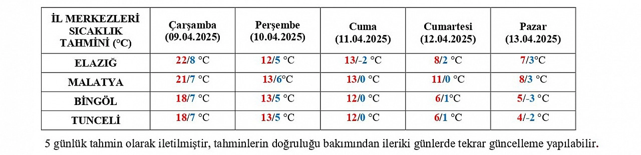 Meteoroloji Genel Müdürlüğü 13. Bölge Tahmin ve Uyarı Merkezi, Elazığ merkezli yayımladığı uyarıda 9-13 Nisan 2025 tarihleri arasında bölge genelinde hava sıcaklıklarının hissedilir derecede düşeceğini ve orta şiddette don beklendiğini açıkladı.