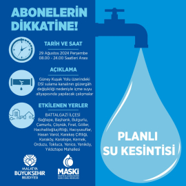 Yapılan açıklamada, “Çok kıymetli vatandaşlarımız, 29 Ağustos 2024 Perşembe günü Battalgazi ilçemize bağlı 19 mahallede; Bağtepe, Başharık, Bulgurlu, Çamurlu, Çöşnük, Fırat, Göller, Hacıhaliloğluçiftliği, Hacıyusuflar, Hasan Varol, Karakaş Çiftliği, Karaköy, Karatepe, Kernek, Orduzu, Tokluca, Yenice, Yeniköy, Yıldıztepe Mahallerinde su kesintisi yaşanacaktır. Anlayışınız için şimdiden teşekkür ederiz” denildi.