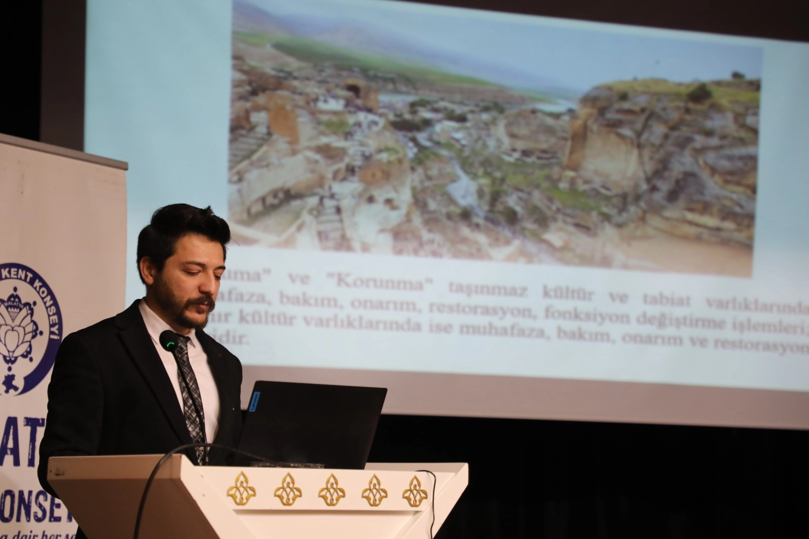 Eğitim programında sit ve sit alanlarına dair bilgiler veren Malatya Turgut Özal Üniversitesi Dr. Öğretim Üyesi Mevlüt Anıl Fidan, “Tarihi devirler boyunca çeşitli medeniyetlerin bir ürünü olup yaşadıkları devirlerin sosyal, ekonomik ve demokratik özelliklerin, kültür varlıklarının yoğun olarak bulunduğu arazilerde, coğrafyalarda karşımıza çıkan ve tespiti yapılmış alanlara sit alanı diyoruz. Taşınmaz kültür varlıklarının muhafaza, bakım, onarım, restorasyon ve fonksiyon değiştirme işlemleri; taşınır kültür varlıklarında ise muhafaza, bakım, onarım ve restorasyon işlerine koruma yada korunma kavramlarını ekliyoruz” dedi.