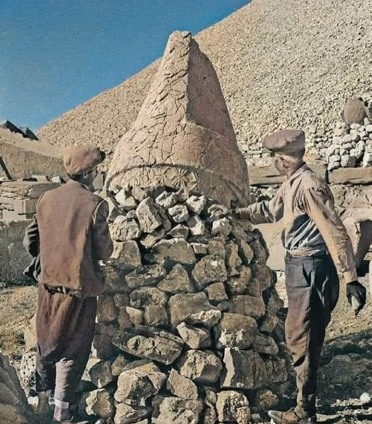 “Nemrut Dağı’nda bulunan Kommagene Krallığı dönemine ait dev heykeller, muhtemelen koruma amaçlı taşlarla örüldüğü zamanlar. Fotoğraf 1962 yılında Ozan Sağdıç tarafından çekilmiş.”