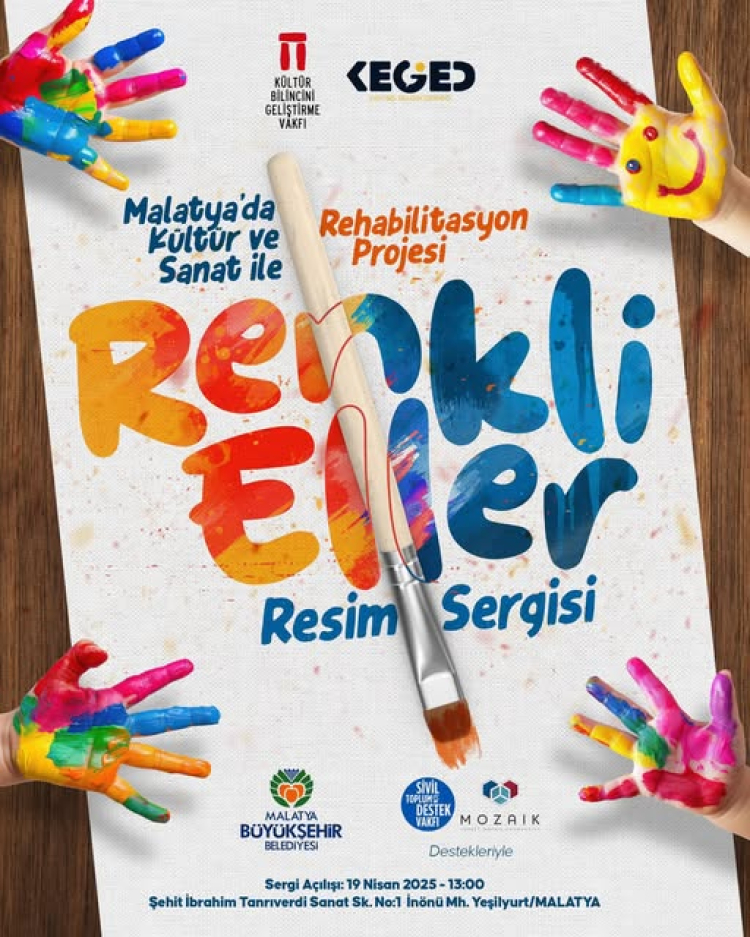 Kültür Bilincini Geliştirme Vakfı’nın, Sivil Toplum için Destek Vakfı ve Turkey Mozaik Foundation hibe desteğiyle Malatya’da yürüttüğü Kültür ve Sanat ile Rehabilitasyon Projesi kapsamında düzenlenen “Renkli Eller” Sergisi, 19 Nisan 2025 Cumartesi günü saat 12.00’de Malatya Sanat Merkezi'nde açılıyor.