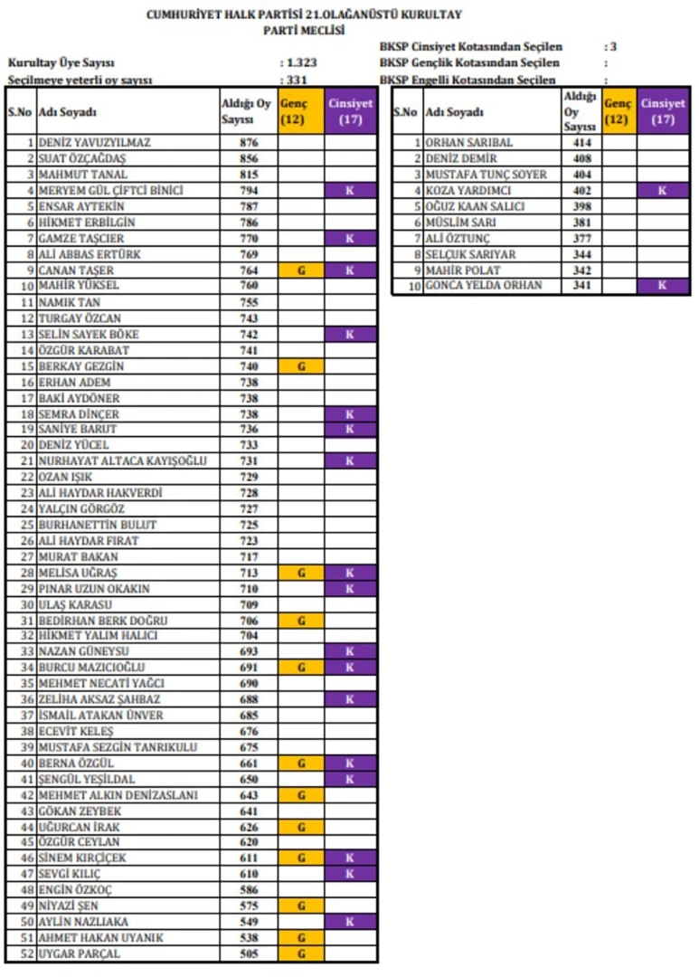 Zonguldak Milletvekili Deniz Yavuzyılmaz, 876 oyla CHP Parti Meclisi seçimlerinde en fazla oyu alan isim oldu. Yavuzyılmaz'ı, 856 oyla İstanbul Milletvekili Suat Özçağdaş, 815 oyla Şanlıurfa Milletvekili Mahmut Tanal takip etti. İlk 10'da ayrıca Gül Çiftci (794), Ensar Aytekin (787), Hikmet Erbilgin (786), Gamze Taşcıer (770), Ali Abbas Ertürk (769), Canan Taşer (764), Mahir Yüksel (760) yer aldı.