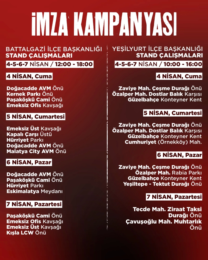 CHP tarafından Battalgazi ve Yeşilyurt bölgesinde farklı alanlarda imza stantları açılarak vatandaşların imzaları alınmaya devam ediyor. Ayrıca diğer ilçelerde de başta İlçe Başkanlıkları olmak üzere mahalle mahalle dolaşılarak destek imzaları alınıyor.