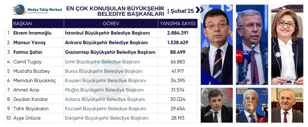MTM Medya Takip Merkezi’nin internet, sosyal medya, televizyon ve yazılı basını kapsayan 10 bini aşkın kaynak üzerinden yaptığı araştırmaya göre; Şubat 2025, belediye başkanlarının projeleri, kararları ve siyasi açıklamalarıyla geniş yankı uyandırdığı bir ay oldu. Özellikle ulaşım, su yönetimi, kentsel dönüşüm ve altyapı projeleri vatandaşların günlük yaşamına doğrudan etki eden konular olarak öne çıktı. Malatya'dan listeye giren başkan çıkmadı.