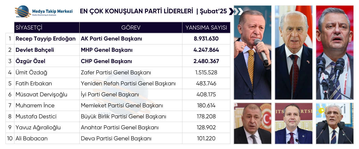 AK Parti Genel Başkanı Recep Tayyip Erdoğan, 8 milyon 931 bin haber ve sosyal medya paylaşımında yer alarak şubat ayının en çok konuşulan parti lideri oldu. CHP Genel Başkanı Özgür Özel’e hitaben kullandığı "Ayaklarını denk al" sözleriyle çokça konuşulan Erdoğan gerek ekonomi politikaları gerekse İmralı süreci nedeniyle siyaset gündeminin merkezine oturdu. Öte yandan ekonomi ve dış politikada atılan adımlar da Erdoğan’ın konuşulma oranını artıran unsurlar arasında yer aldı.