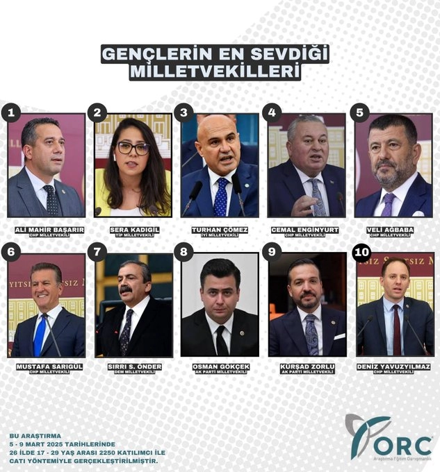 ORC Araştırma tarafından 5-9 Mart 2025 tarihlerinde 26 ilde 17-29 yaş arasındaki 2bin 250 katılımcı ile çatı yöntemiyle yapılan ankette ev sevilen 10 milletvekili sıralandı. Birinci sırada Ali Mahir Başarır, ikinci sırada Seda Kadıgil, üçüncü sırada Turan Çömez, dördüncü sırada Cemal Enginyurt yer alırken Malatya Milletvekili Veli Ağbaba'da beşinci sırada yer aldı.